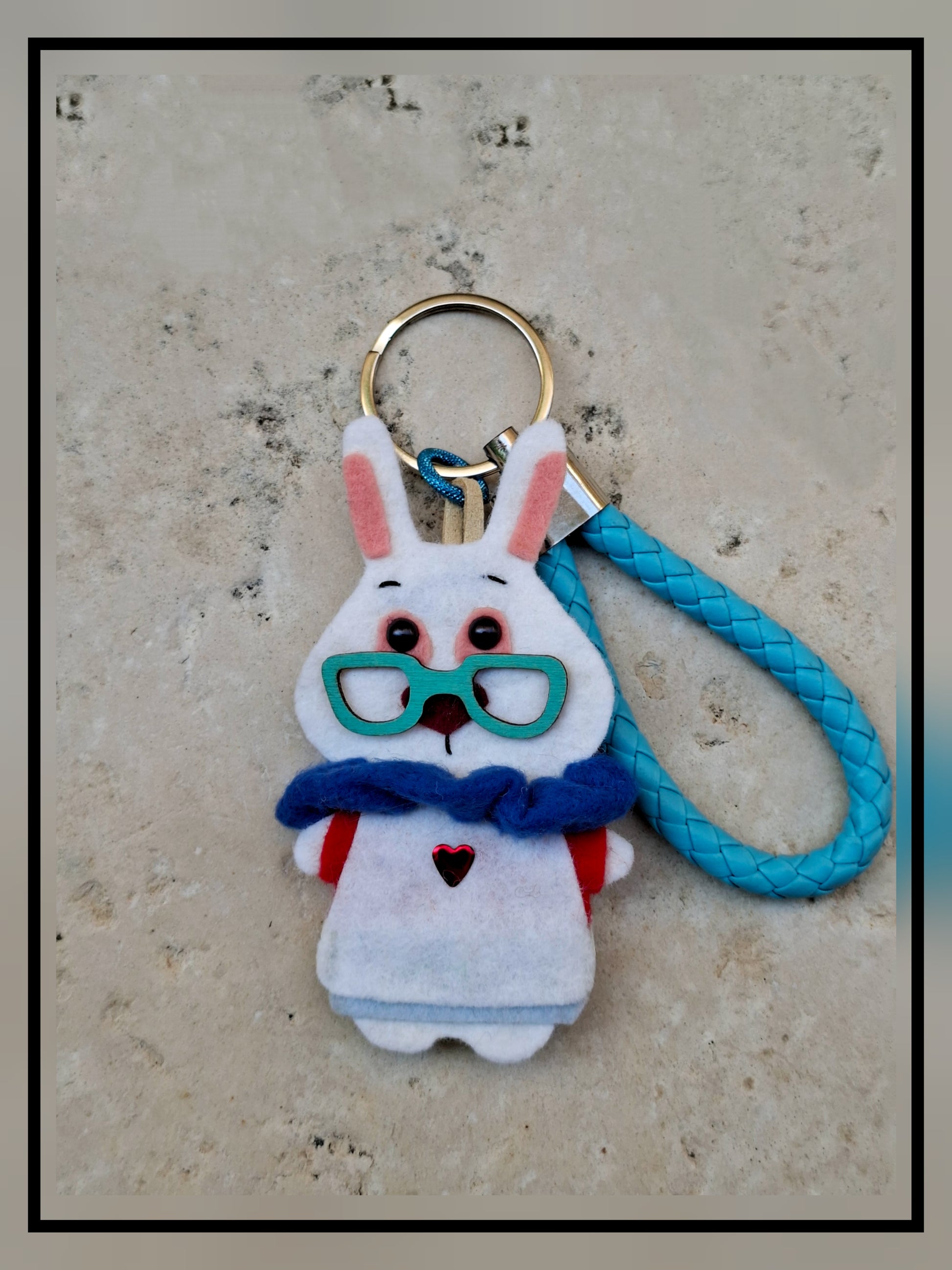 Portachiave realizzato a mano, i materiali utilizzati sono pannolenci tessuti e nastri.