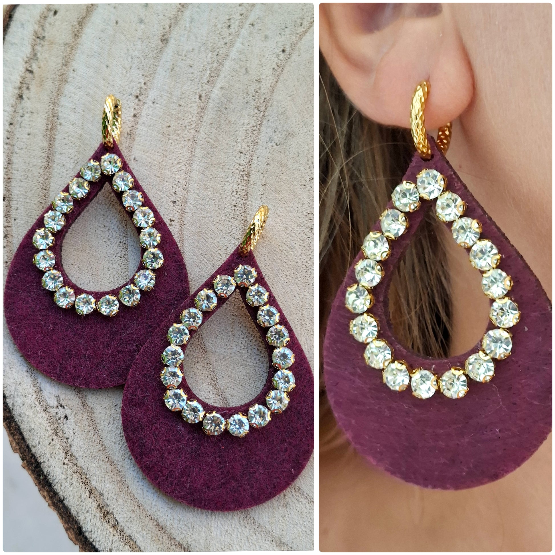 Orecchini con cerchietti in martellati pendenti in tessuto feltro con strass in vetro e strass